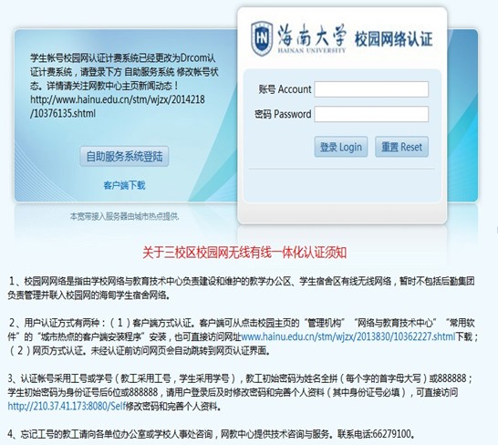 1、 WEB方式。选择校园无线ssid(Hainu_***),连接后弹出登陆界面,填入账号、密码;如需注销,在浏览器中输入192.168.0.21后,点击“注销”。