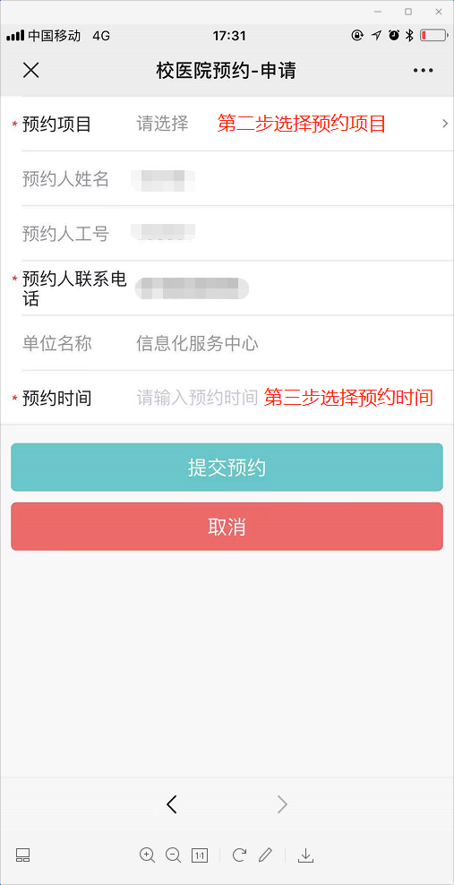说明:需要先选择预约项目和预约日期,最后选择预约时间段,已被预约的时间段不可选择。点击“提交预约”即可完成预约,如果该项目已经预约过,将无法再次预约,需要撤销之前的预约。