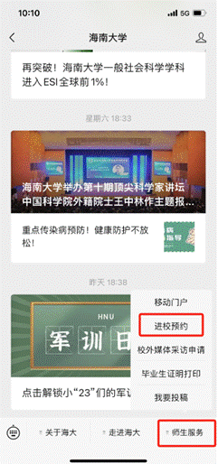 1. 校外人员先关注海大官方公众号,进入公众号后,选择“师生服务”菜单,再点击“进校预约”即可进入进校预约的界面,也可通过扫描相关二维码进入。