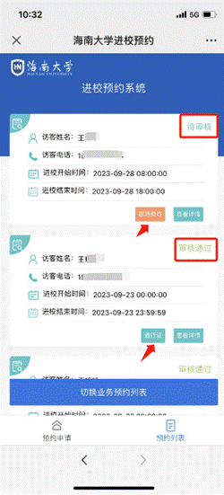 3. 提交预约后,等待被访单位进行审核,可在预约列表查看审核的状态,审核通过后才可按照进校时间进出校门。
