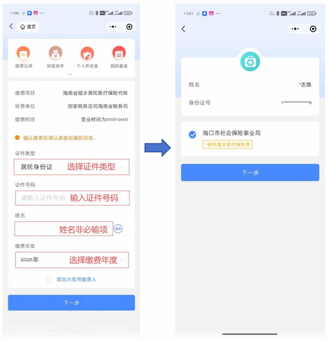 步骤一:用户在点击医保缴费链接后,将进入页面一。在此页面,用户需依照提示选择证件类型(默认为居民身份证),输入证件号码及姓名(此为可选项),并选定缴费年度(在集中征缴期间,默认为次年;非集中征缴期间,默认为当年),随后点击“下一步”按钮继续;